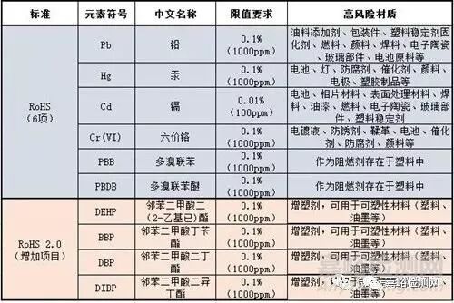 RoHS针对所有生产过程中以及原材料中可能含有铅、汞、镉、六价铬、多溴联苯和多溴二苯醚这六种有害物质的电气电子产品的限制使用管理办法,包括白家电,黑家电,电动工具,医疗电气设备等。RoHS 2.0新增四种邻苯二甲酸酯(DEHP、BBP、DBP、DIBP)限制物质。